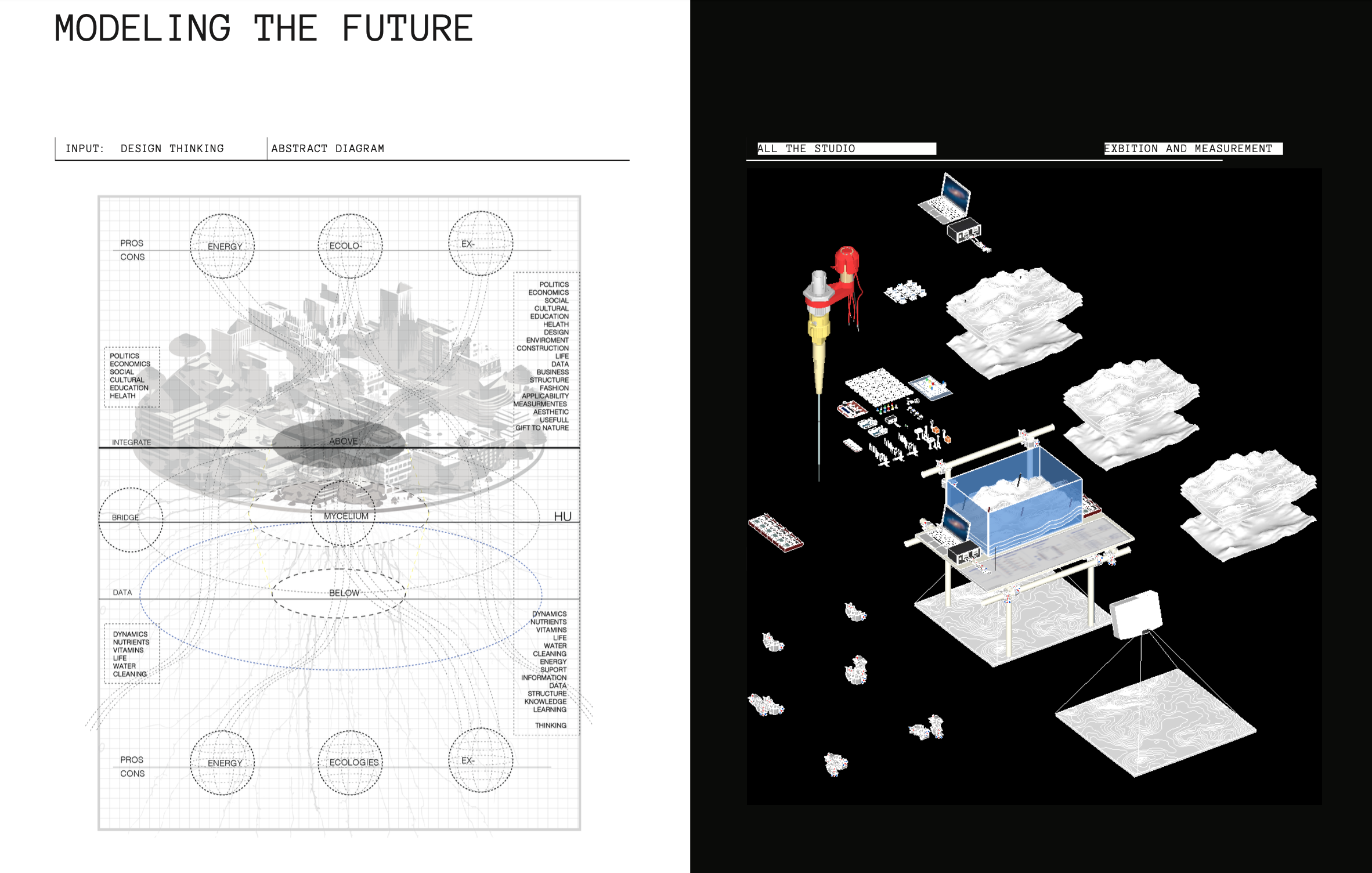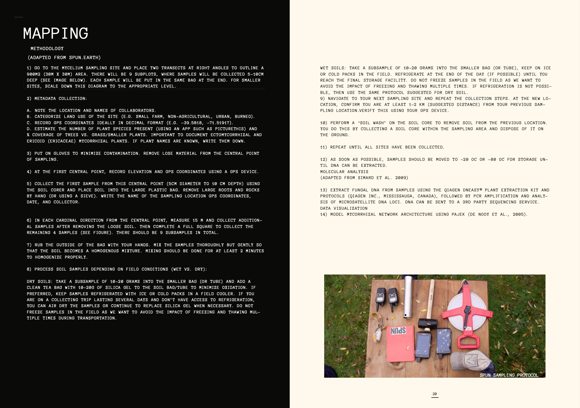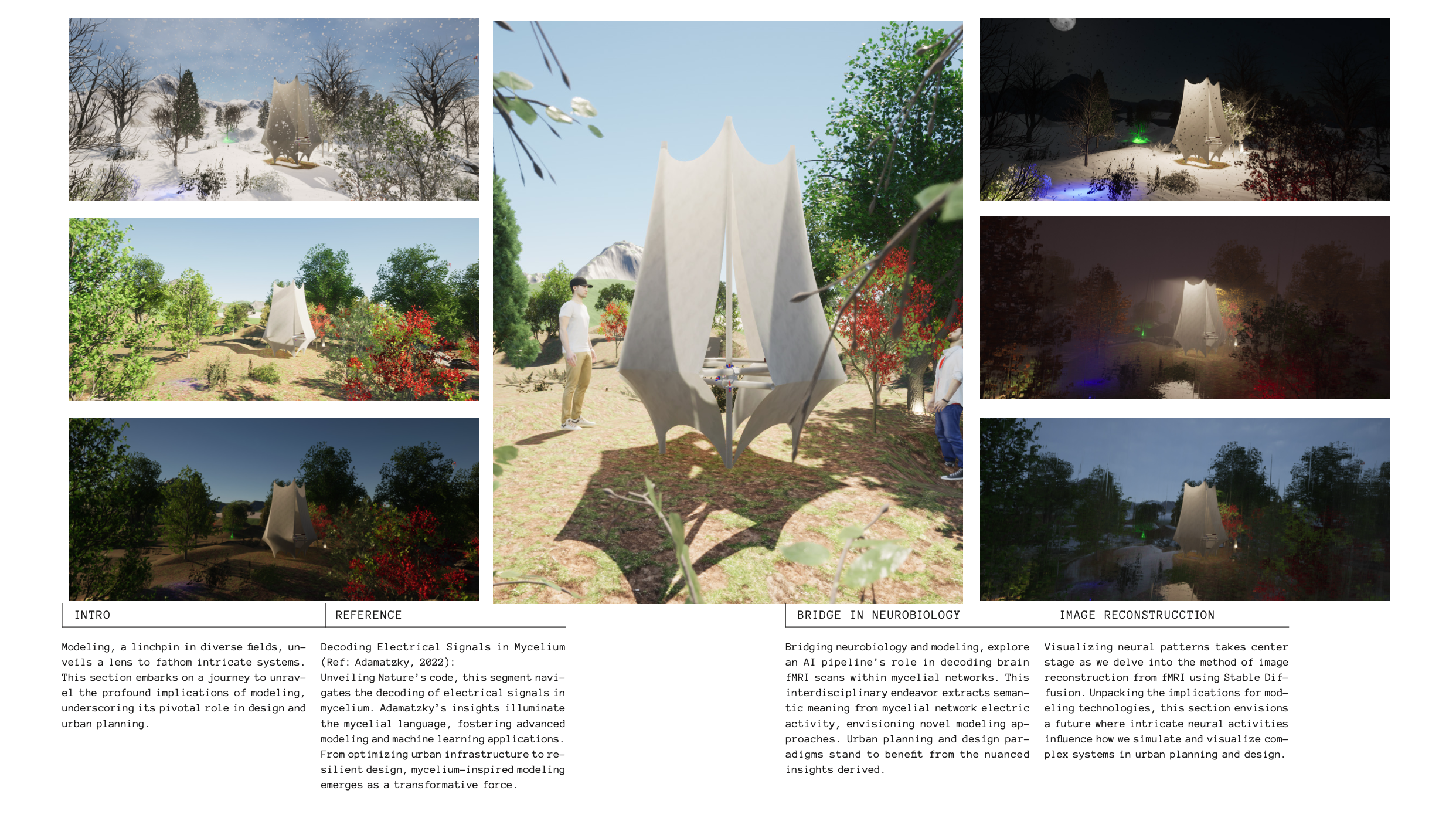 The critical leap we must take in the 21st century is radically ancient: working with the more-than-human world to create mutually beneficial ways of living in contemporary ecosystems. Since 2020 marked the year where the human-built environment outweighed all organic lifeforms1, we ask the following question: what would it mean to design as an expression of the land itself? Working with architect Kevin Johnson, we sought to prototype this idea by interrogating one specific aspect of the land: subsoil mycelial networks. Because mycorrhizal networks are responsible for coordinating forest regeneration and have been called the ‘largest living cognition on earth,’2 we treat this network as a living library we can interface with in designing place-specific human settlements. We analyze this in 4 interrelated subsections: Mapping, Measuring, Modeling and Mimicking.